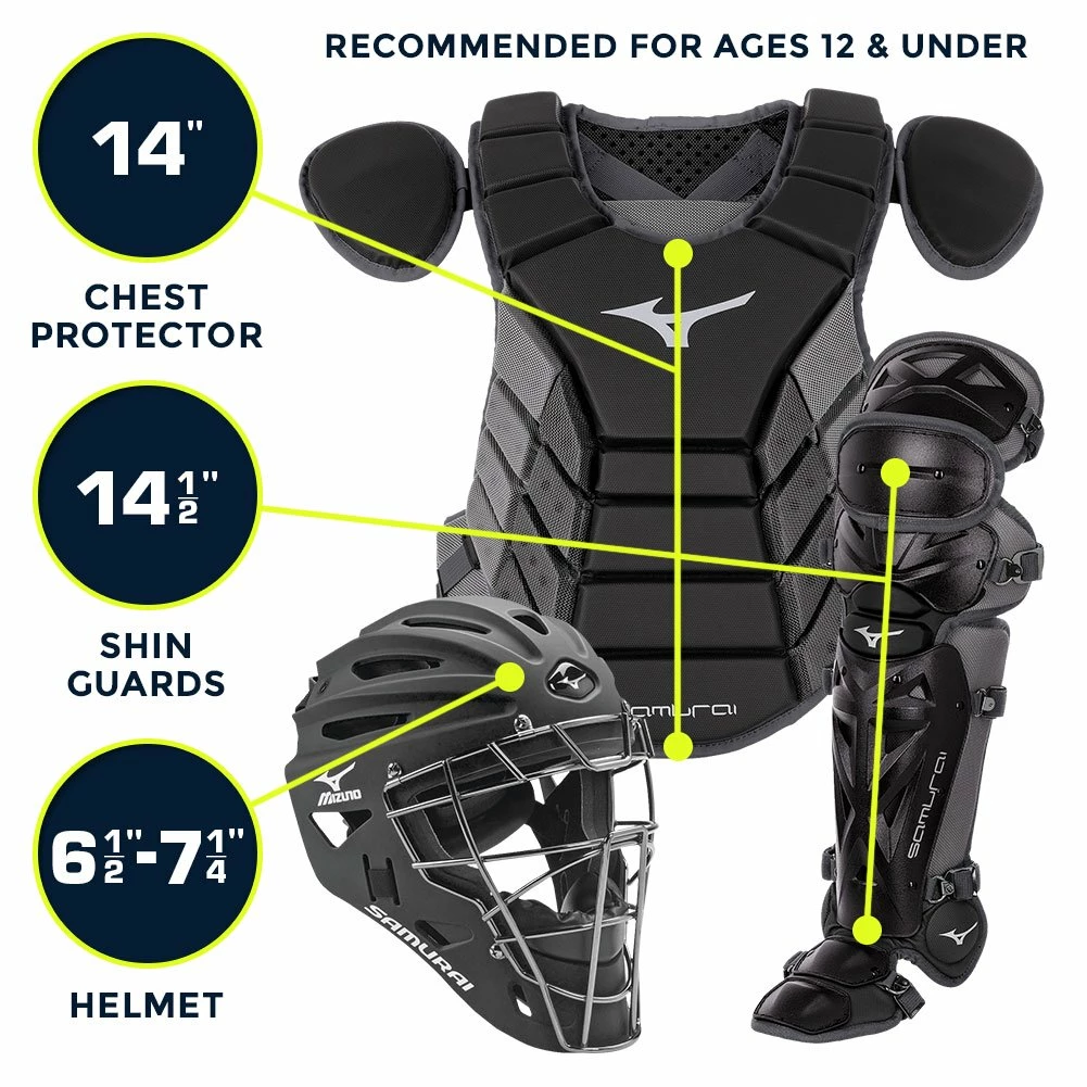 Make sure you give your young catcher every chance to succeed when you outfit them with the Mizuno Youth Samurai Catcher Set. Providing ultimate protection from head-to-toe, this catchers gear gives you peace of mind when they take their position behind the plate, and they will appreciate the comfort and mobility as well while they learn the position. This set is recommended for youth ages 12 and under.